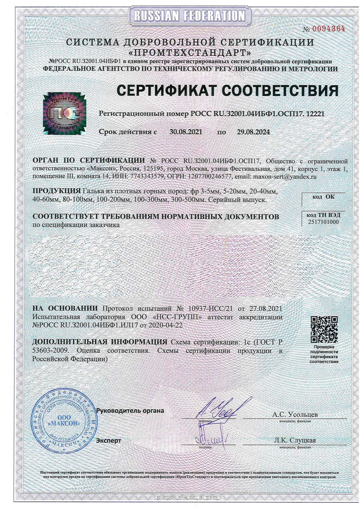 Сертификат соответствия на речную гальку