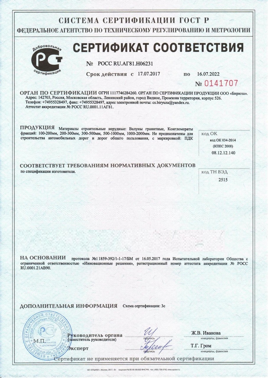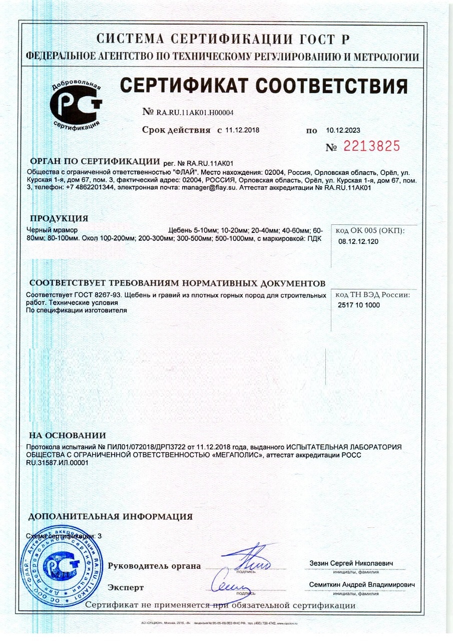 Сертификат соответствия – документ, подтверждающий соответствие продукции требованиям качества и безопасности, установленными для нее действующими стандартами и правилами. Наш камень, который Вы сможете заказать с доставкой в Россоши , обладает всеми необходимыми документами для реализации и при необходимости могут быть предоставлены все необходимые подтверждающие документы при поставке.